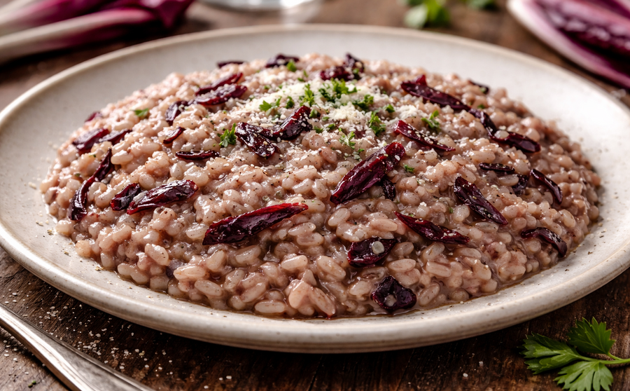 Taglia il radicchio a listarelle sottili. In una casseruola, fai soffriggere lo scalogno tritato con un filo d’olio. Aggiungi il riso e tostalo per qualche minuto. Sfuma con il vino rosso. Unisci il radicchio e mescola. Porta a cottura aggiungendo brodo poco alla volta. A fine cottura, manteca con burro e parmigiano per ottenere una consistenza cremosa.